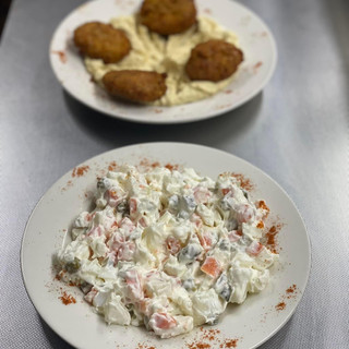 A delicious combination of hot and cold starters! Our flaversome homemade falafels served with hummus and a yummy Russian Salad perfect for an evening snack🫒🥬🥚🥙All served with a scrumptious Turkish flat bread🤪